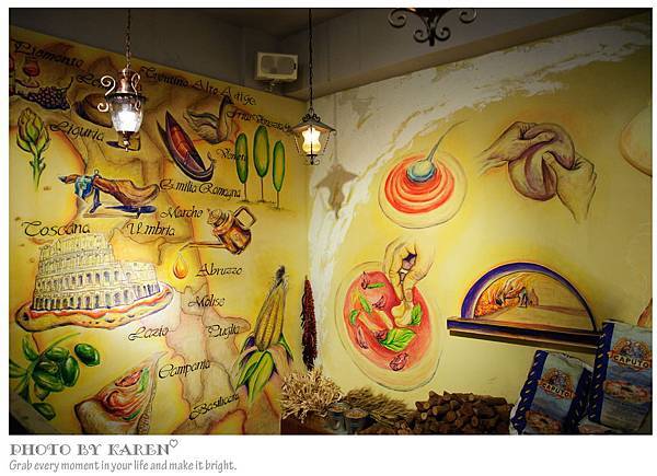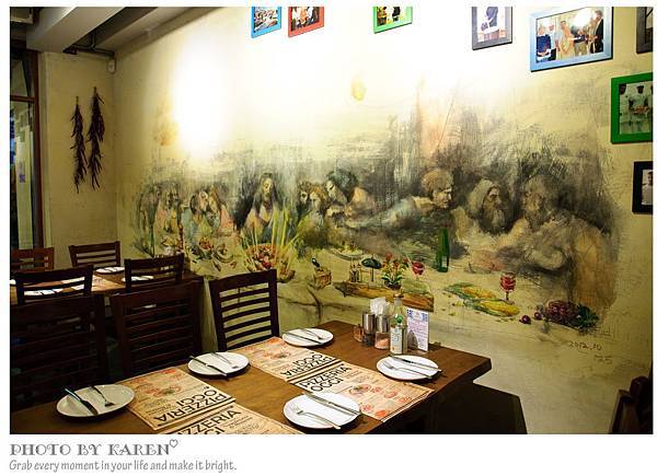 簡單的木桌、手繪風壁畫、暖色系的燈光照明,