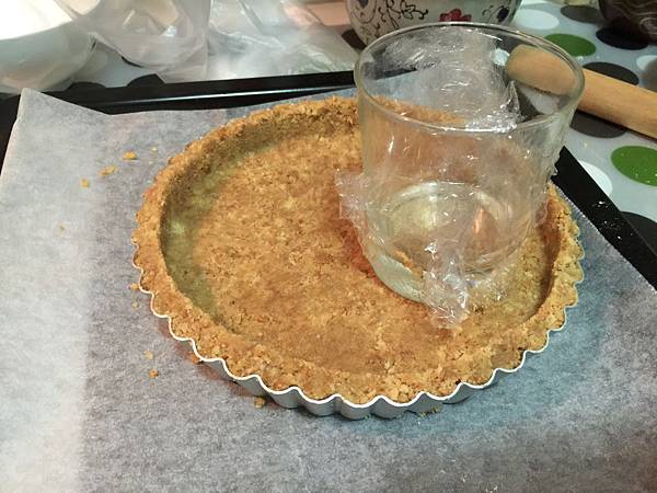 1. 威化餅磨碎、加入融化奶油,放入派模,壓緊