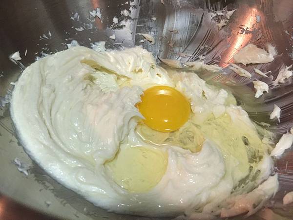 3. 加入蛋、香草精,攪拌均勻 (怕攪拌過度,這邊我換手動打蛋器)
